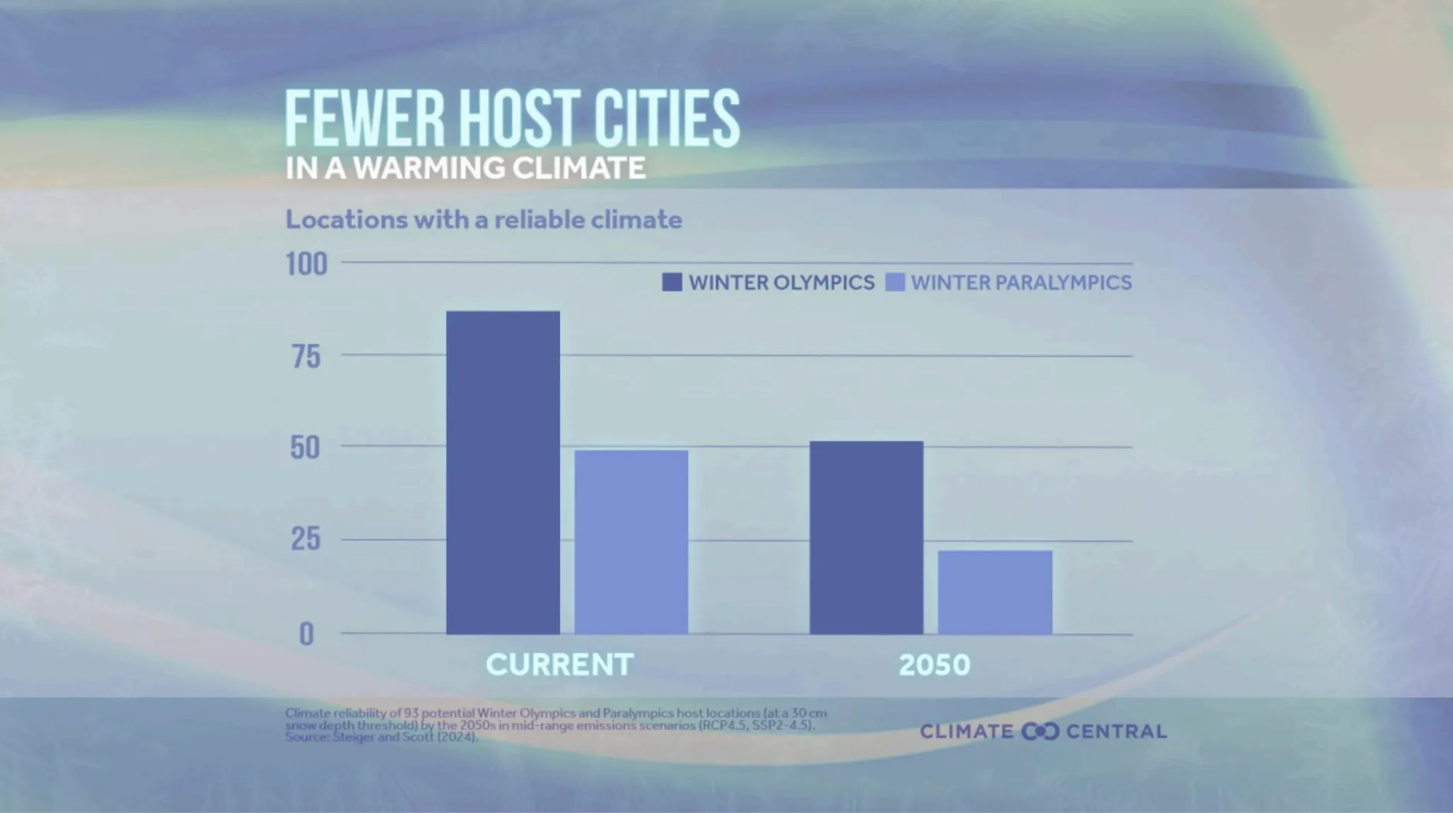 Under a mid-range warming scenario that assumes global emissions pledges are met, only 52 of the 93 locations are expected to retain reliable Olympic conditions by the 2050s. The outlook is more concerning for the Winter Paralympics, which are held later in the season.