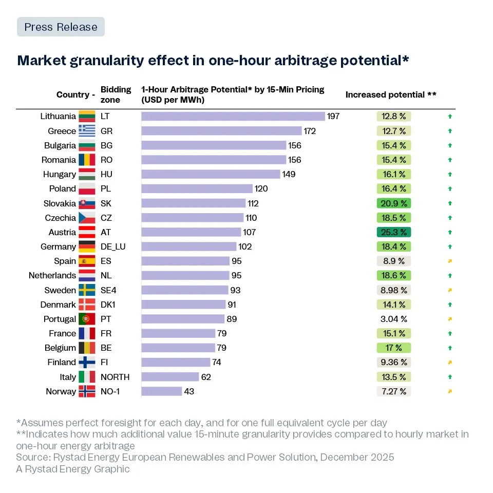 In October, when Europe’s day-ahead electricity market shifted from hourly to 15-minute MTUs, it enabled quarter-hour energy trading, which proved far more profitable than trading across a full hour. For example, in Lithuania, shifting energy over 15 minutes earned about $263 per megawatt-hour (MWh), 14% more than hourly trading. In Germany, quarter-hour arbitrage was 16% more profitable than hourly arbitrage.